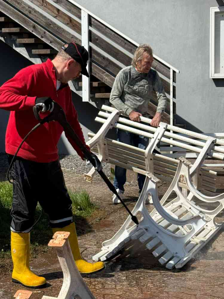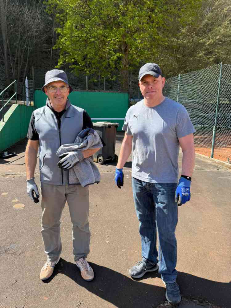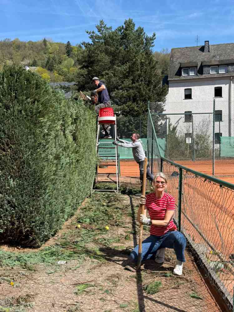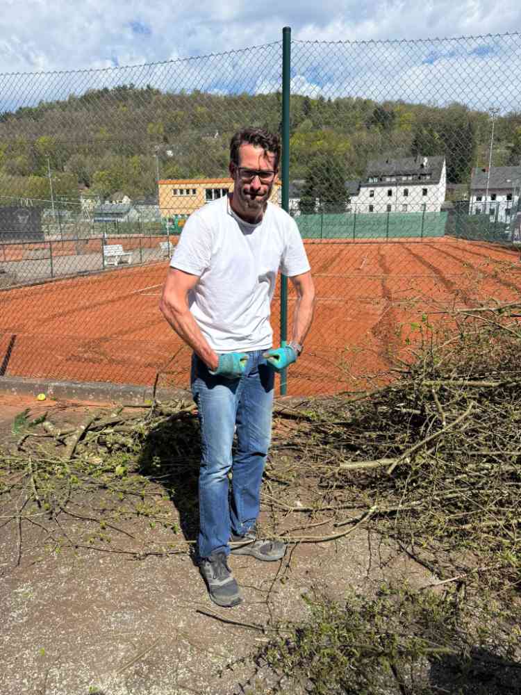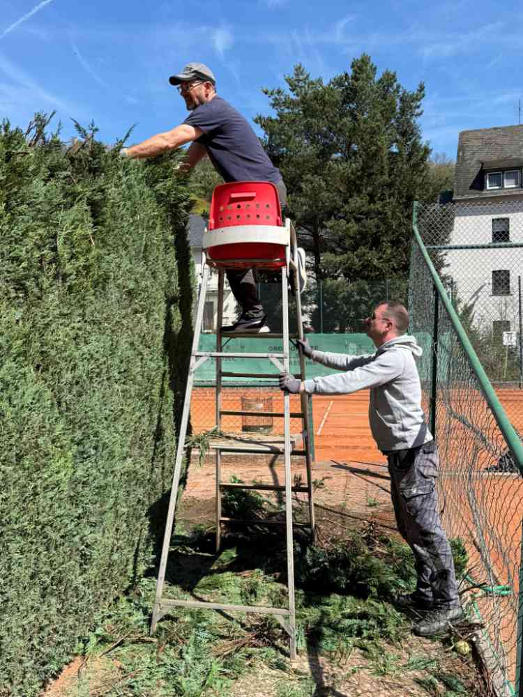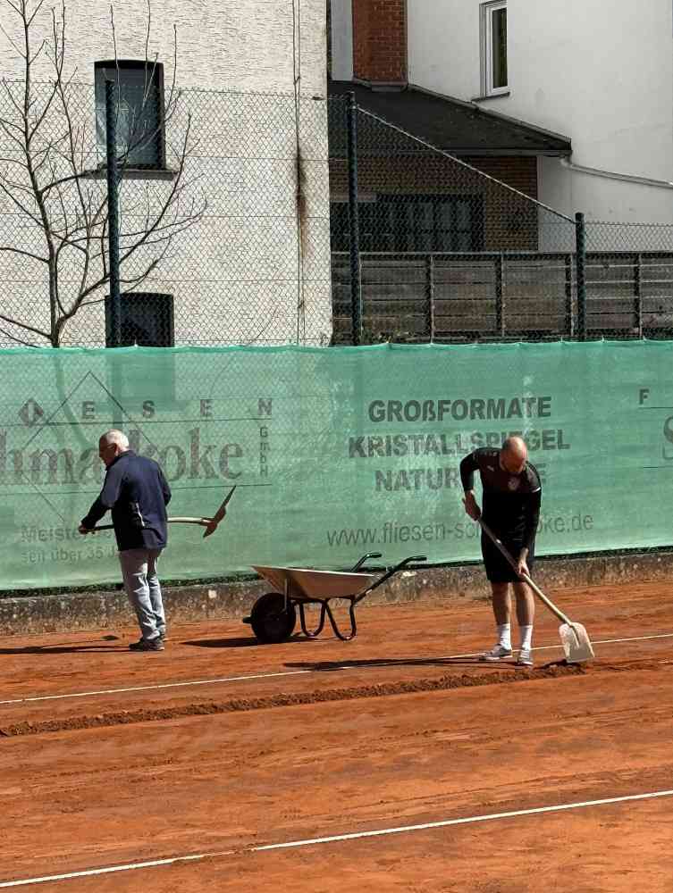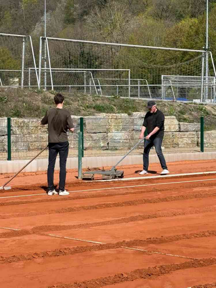 Es ist 2024 und unsere Anlage sowie die Aussenplätze müssen aufgeräumt, repariert und für die kommenden Medenspiele, Turniere und für unsere Mitglieder auf Vordermann gebracht werden. Banner der Sponsoren aufhängen, Zäune instand bringen, Unkraut jäten und Aufräumen stand heute auf dem Programm. Sogar schweres Gerät kam zum Einsatz, um einen ganzen Berg alten Tennissandes abzutragen.